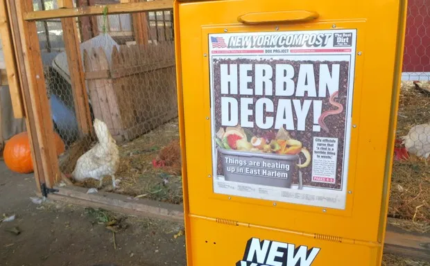 东哈莱姆的一个纽约堆肥箱。黛比·乌尔曼你听说过吗?印刷已经死了。然而,未死的是新鲜的土壤。土壤是由之前的食品残渣产生的微生物扭动而成,堆肥产生的土壤是黑色、丰富且富有生产力的——城市农民的梦想。