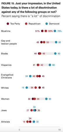 42%的特朗普支持者认为“白人在美国今天面临很多歧视。”白人工人阶级美国人也表达了对个人歧视的强烈感受。近四分之三的特朗普支持者认为“对白人的歧视已经成为与对黑人和其他少数族裔的歧视一样大的问题”,这一比例在其他共和党候选人的支持者中为57%,在所有美国人中为25%。42%的特朗普支持者认为“白人在美国今天面临很多歧视”,比支持其他共和党候选人的人多出12%。