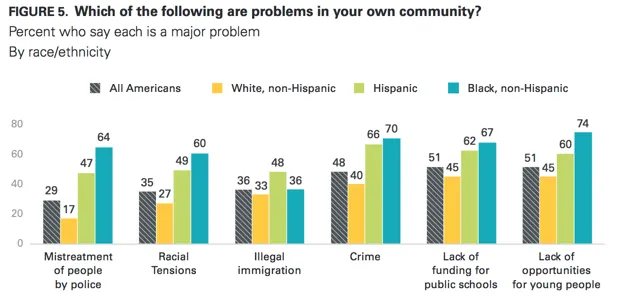 PRRI 2015 美国价值观调查白人工人阶级美国人对针对黑人和其他少数群体的歧视看法截然不同。只有 47% 的人不同意少数群体“在刑事司法系统中受到平等待遇”,而整体美国人中这一比例为 58%,黑人(85%)和西班牙裔美国人(67%)的比例则更高。