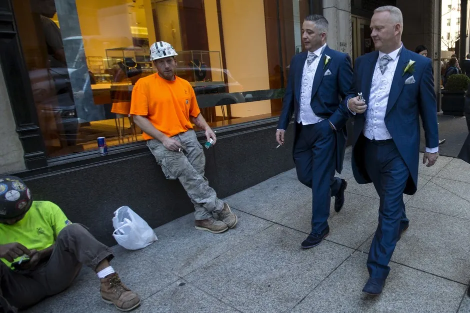 两位身穿晚礼服的男子走过在曼哈顿中城人行道上休息的建筑工人。路透社/迈克·塞加尔根据本周公共宗教研究所发布的美国价值观调查,弗雷德·弗林斯通和阿奇·邦克在2015年依然活得很好。在周二的会议上,超过一位小组成员提到这些电视角色作为理解白人工薪阶层美国人在移民、种族歧视和刑事司法等问题上的感受的模型。
