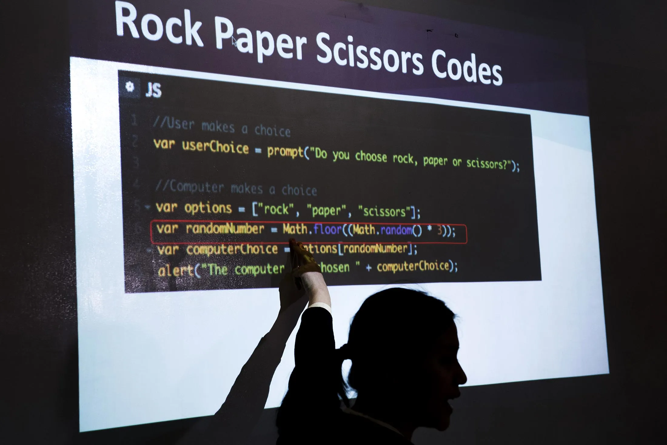 一位讲师指着第一代码学院的石头剪子布游戏的代码行。