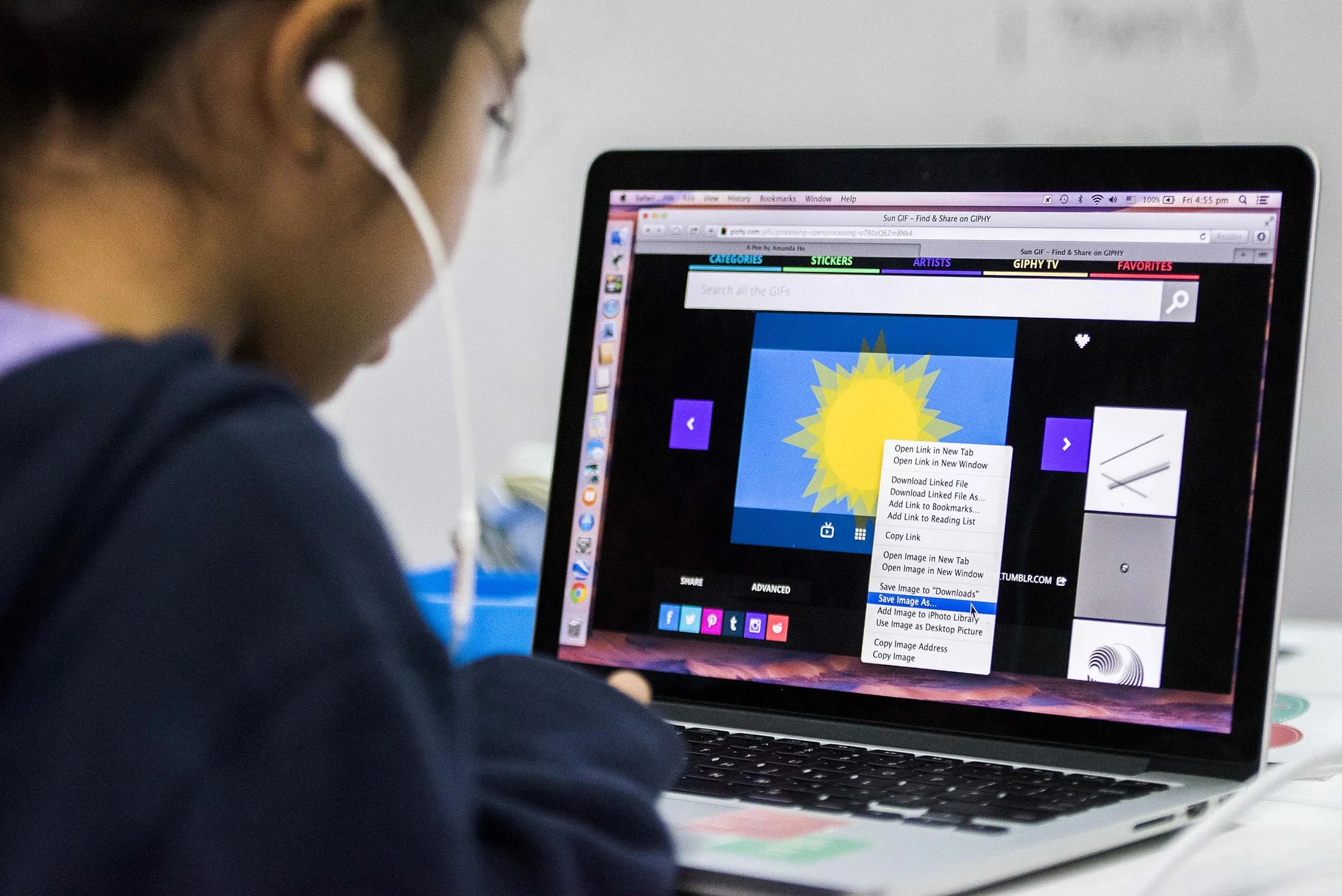 一名学生在她的笔记本电脑上寻找图像以开发应用程序。