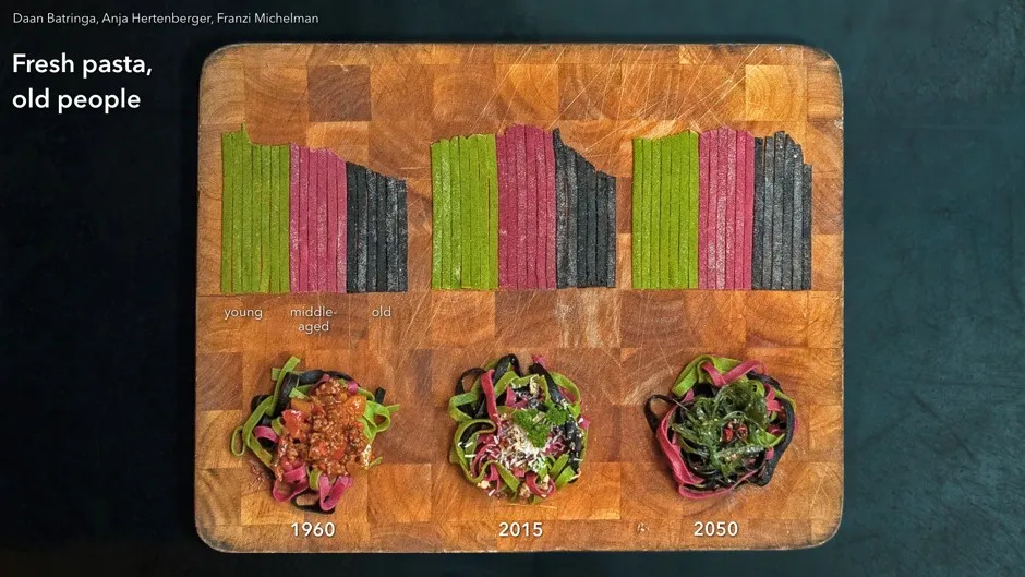 雅什科和斯特凡尔写道:“使用1960年、2015年和2050年荷兰公民的人口金字塔形式的数据,制作了一道意大利面图形。三种颜色代表年轻人(绿色)、不再年轻的人(红色)和老年人(黑色)。为了展示不同年龄组的风味,1960年代的意大利面上覆盖了一种由Knorr制作的预制香料混合的肉酱。2015年的‘回归基础’意大利面配有卡邦纳拉,而未来的意大利面则是面条和海带沙拉的混合。”