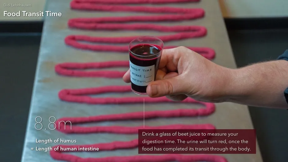 杯子的用途由莫里茨·斯特凡尔和苏珊娜·雅什科解释,他们组织了莱瓦登的餐食以及在柏林、巴塞罗那、赫尔辛基等地的数据美食工作坊。“这条8.8米长的鹰嘴豆泥代表了人类肠道的平均长度。在吃鹰嘴豆泥之前,每位参与者都会获得一个塑料杯来收集尿液,”他们在邮件中写道。“参与者应在杯子上写下自己的名字和摄入时间。当尿液变红时,鹰嘴豆泥已被完全消化,参与者应在杯子上记录自己的消化时间。”