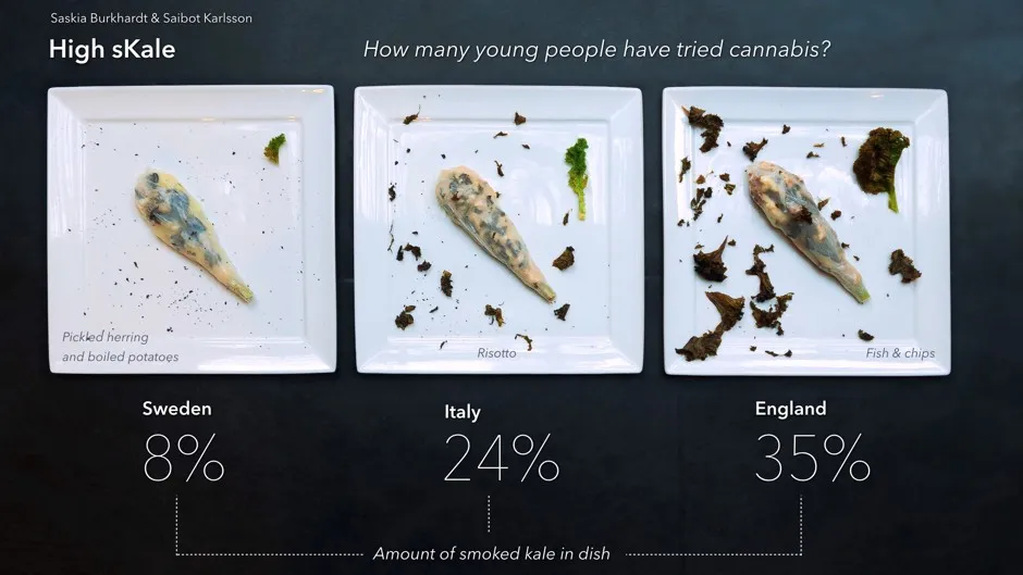 J & S:“烟熏羽衣甘蓝是这些菜肴的关键成分,这些菜肴基于关于15至16岁孩子在英格兰(35%尝试过大麻)、意大利(24%)和瑞典(8%)的消费数据。用代表不同国家的馅料制作了三个大卷烟:炸鱼薯条、意大利烩饭和腌鲱鱼配煮土豆。根据吸食大麻者的数量,每种馅料中都加入了烟熏羽衣甘蓝。”