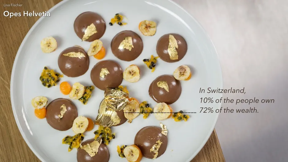 “瑞士财富”是对瑞士财富不平等的丰盛表现,由巧克力、香蕉和可食用金箔制成:
