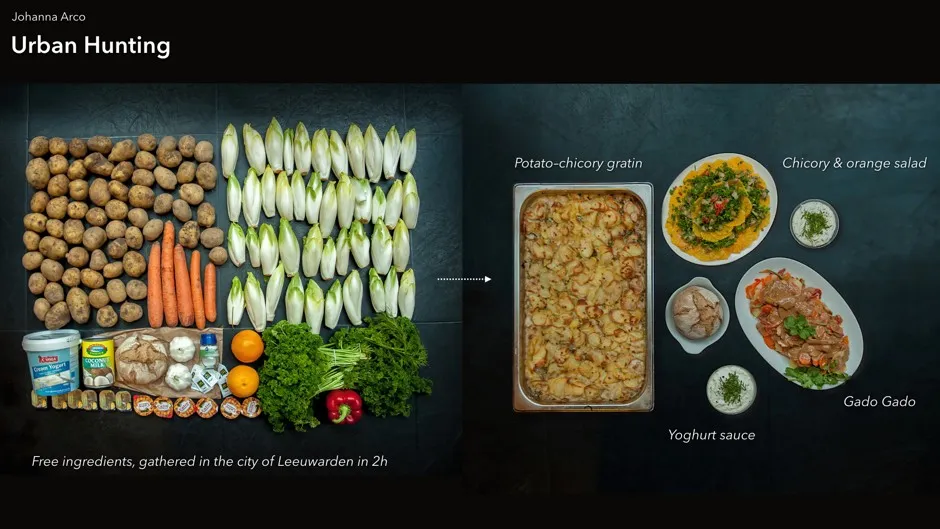 J & S:“约翰娜在周六早上两个小时内在利沃丹中心可以免费收集到的所有食物被用于制作四道菜:土豆菊苣焗菜、菊苣橙色沙拉、酸奶酱和一个gado-gado(印尼沙拉)。约翰娜没有选择代表数据,而是决定自己收集数据,看看在非常有限的时间内她能做些什么。”
