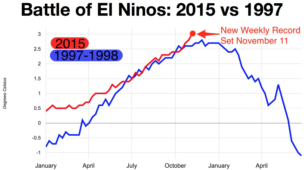 每次厄尔尼诺都是独特的,今年尚未被认为是最糟糕的。根据大多数标准,这个称号由1997-98年保持,该年记录了三个月期间的最高持续温度。1447798998021 如果当前条件持续,2015年可能会超过该记录。