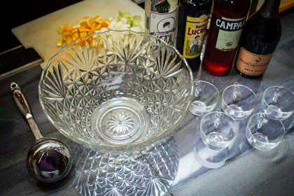 4杯新鲜水果,切丁1/2杯德梅拉拉糖2杯坎帕里2杯阿马罗·卢卡诺1杯梅斯卡尔2瓶玫瑰香槟1/2杯八角大冰块