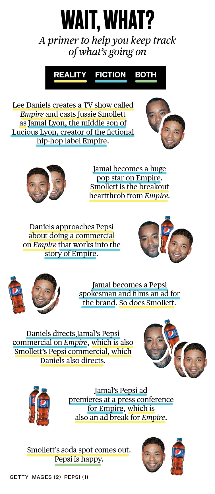 摄影师:安德鲁·赫瑟林顿,彭博商业周刊在站台的另一端,百事可乐的市场营销人员在一对监视器上观看这一场景,向丹尼尔斯传递便条。不出所料,他们似乎希望贾马尔在变身饮用汽水的瞬间多停留一会儿。为了确保广告在帝国之后仍能继续存在,他们安排了几次拍摄,让斯莫莱特以他自己,一个崭露头角的电视演员的身份,而不是作为贾马尔·莱昂,这位崭露头角的虚构流行明星。