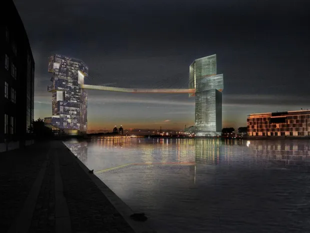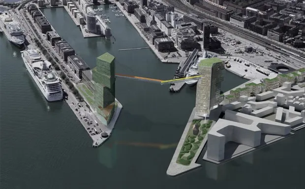 由美国建筑师史蒂文·霍尔与这些塔楼共同设计,这座桥将不在水面上方,而是在65米(213英尺)的高度跨越塔楼。这一高度将提供城市的壮观视野,并为抵达城市游轮码头的乘客创造一个新的视觉入口。霍尔的双塔和桥在2008年赢得比赛后,终于将在2016年开始建设。