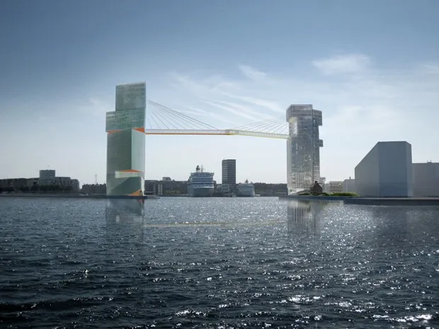 哥本哈根门 是一个壮观的计划,旨在连接丹麦首都再生港口的不同部分,使用专为骑自行车和行人设计的悬索桥。正是桥的支撑结构使其具有开创性。这座桥将悬挂在位于港口入口对面的混合住宅和办公大楼之间。