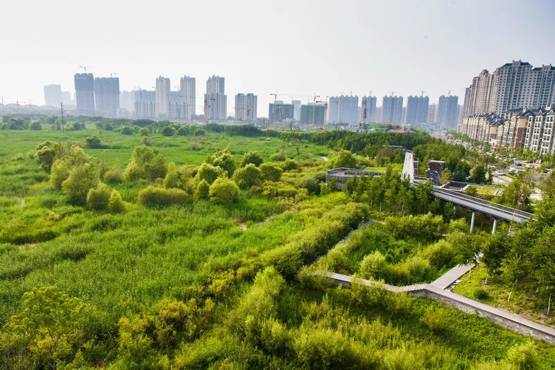 2014年开放的燕尾洲公园的鸟瞰图,2015年获得世界年度景观奖。土人景观“海绵城市是能够以自然方式储存、清洁和排水的城市,采用生态方法,”余说,他正在帮助协调这个国家项目。