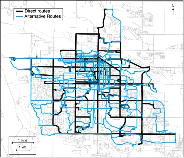 福特科林斯的地图,显示了研究参与者所采取的直接(黑色)和替代(蓝色)路线。暴露科学与环境流行病学杂志然而,平均暴露和累积暴露之间出现了一个重要的区别,后者考虑了通勤的持续时间: