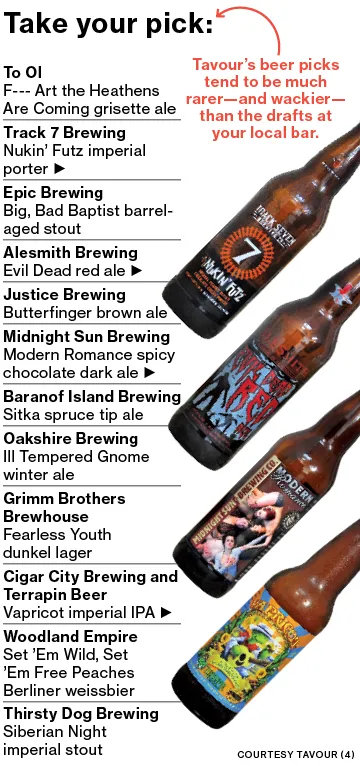 一旦客户注册了Tavour的电子邮件服务,他们每天(有时每天两次)会收到一份特定高评价手工啤酒的限量供应,数量为3到12罐或瓶。选项包括各种国内酿造的啤酒——来自俄勒冈州De Garde Brewing的Saison Premiere,来自俄克拉荷马州Prairie Artisan Ales的Bomb!——以及相当数量的进口啤酒,如比利时的Brouwerij Van Steenberge Gulden Draak Brewmasters Edition。更为独特的选择包括花生酱波特和单品花啤酒。
