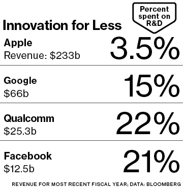 与其资源相比,苹果公司相对保持低调。根据彭博社的数据,它在2015财年仅花费了2330亿美元收入的3.5%(81亿美元)用于研发,这一比例低于其他所有大型美国科技公司。相比之下,Facebook在研发上花费了约21%(26亿美元),芯片制造商高通花费了22%(56亿美元),而Alphabet则花费了15%(92亿美元)。