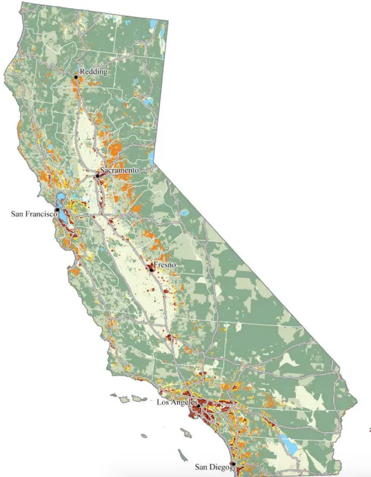一份2013年的报告为加利福尼亚能源委员会准备,发现加利福尼亚的开发每年导致110英亩树木的损失——这种森林砍伐释放储存的二氧化碳并加剧大气变暖。与加利福尼亚用于伐木的土地面积相比,这是一小部分,但这很重要,特别是考虑到沿森林边缘的开发正在西部各地蔓延。随着这种开发扩展到自然森林区域,它对气候变化产生了影响。