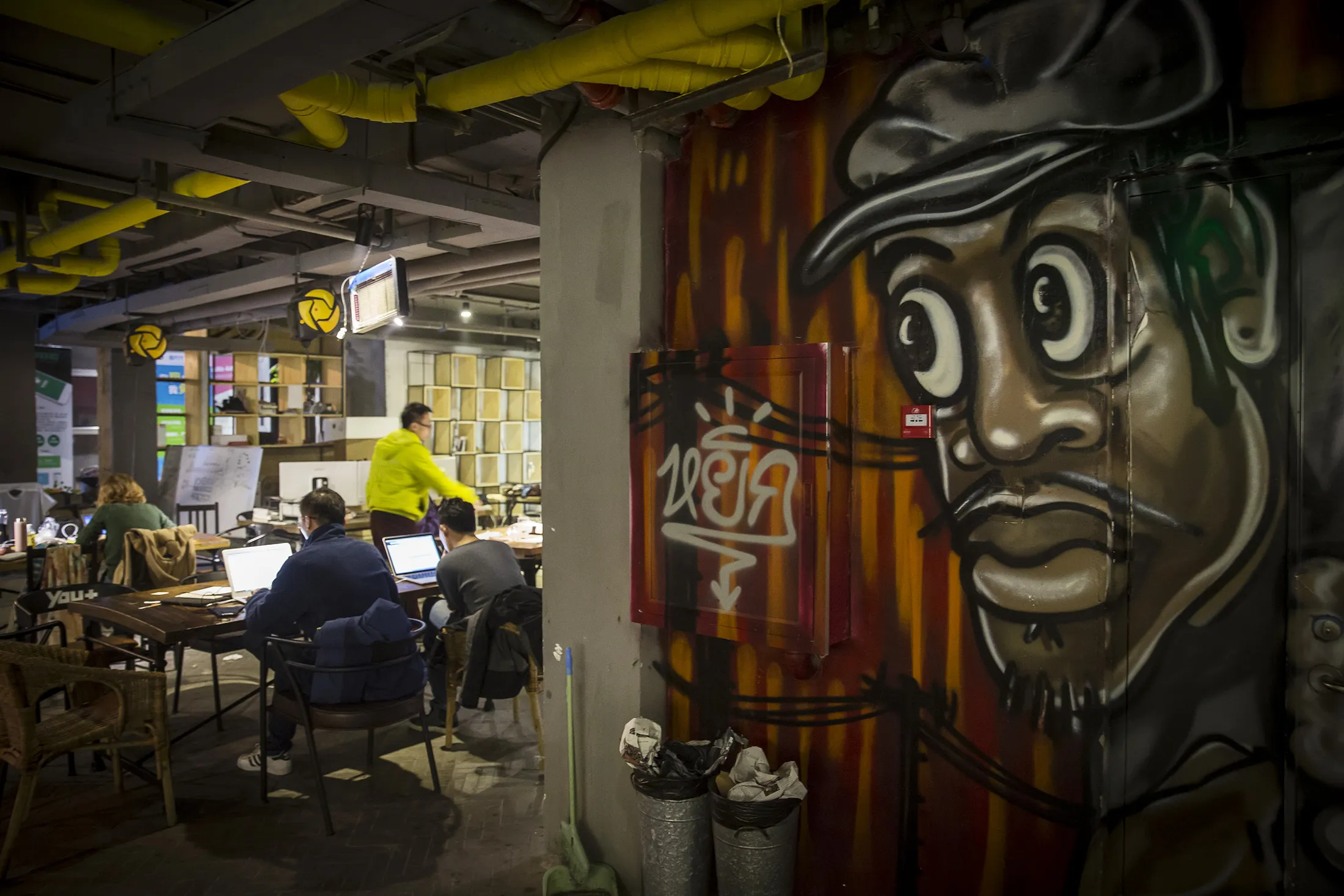 在大楼入口附近有一个公告板,上面贴满了粉色和黄色的便签,寻找服务交换——例如,按摩换遛狗。还有社区60多家初创公司的招聘信息。
