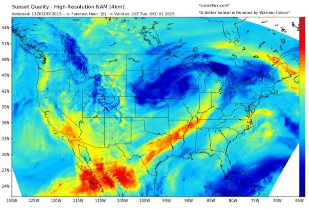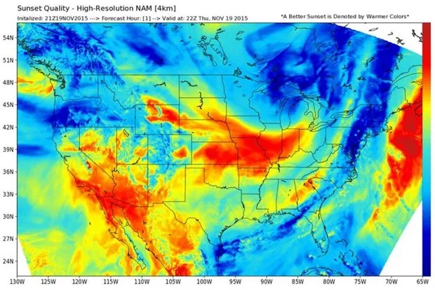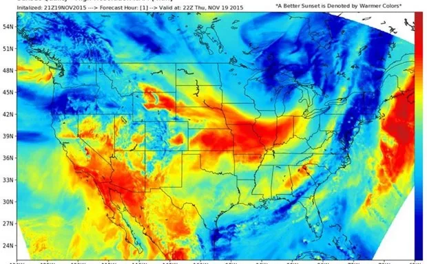 不久前,哈莱特与宾州州立大学气象系的几位朋友本·雷普特和雅各布·德弗里奇合作,帮助建立了一张预测生动日落的地图。该工具托管在 WX日落(“WX”是摩尔斯电码中“天气”的缩写),该工具使用定期更新的 NAM模型 来预测红色和黄色等温暖色调的美丽日落。以下是昨晚的模型运行: