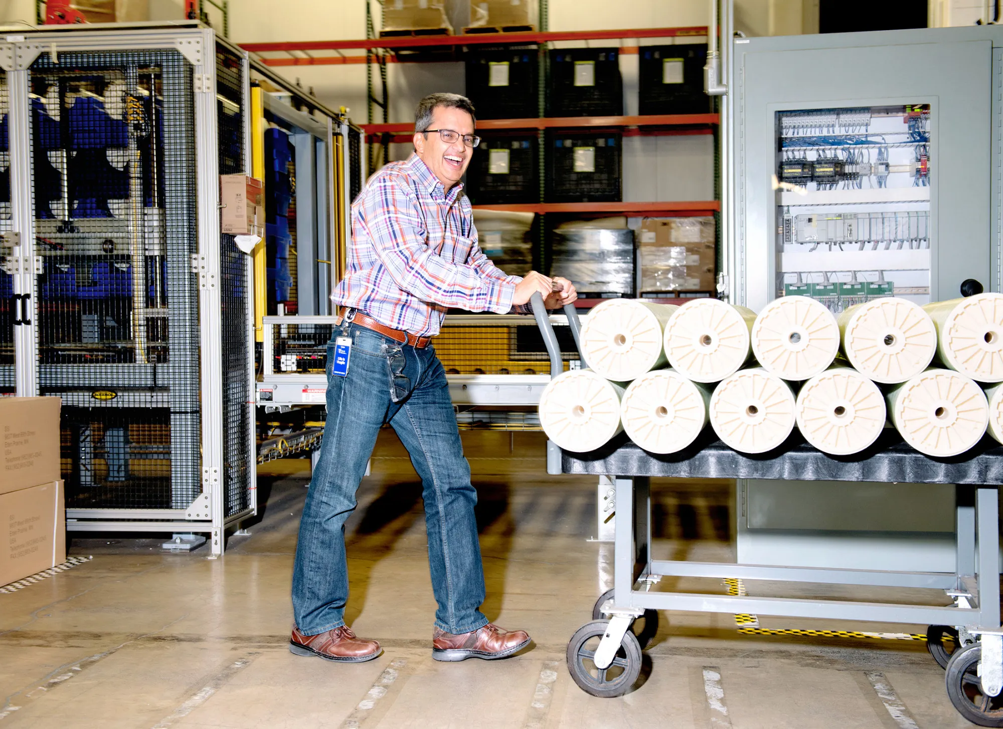 德赛在埃迪纳的制造设施中搬运一批反渗透水过滤器。