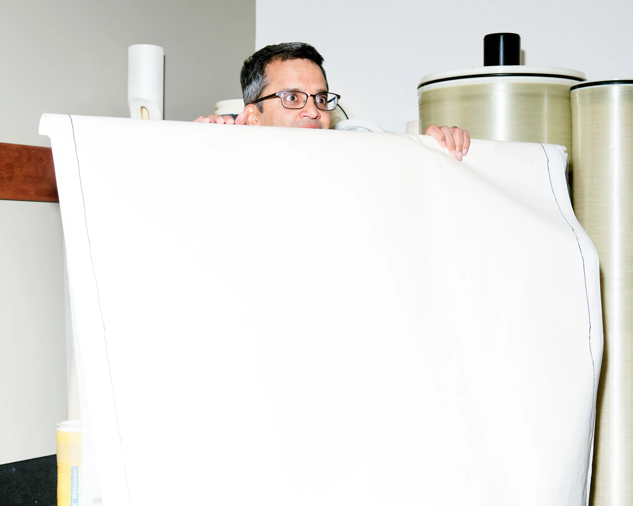 膜行业的神经中枢位于明尼苏达州埃迪纳的一座不起眼的金属仓库,位于双子城之外。“这是地球上任何地方在一个屋檐下制造的膜数量最多的地方,”德赛说。这里每天制造数万台反渗透设备。这些膜比描图纸还薄,层叠着网状间隔物,允许水流过;然后它们被卷成圆柱,包裹在玻璃纤维中,进行测试和包装。