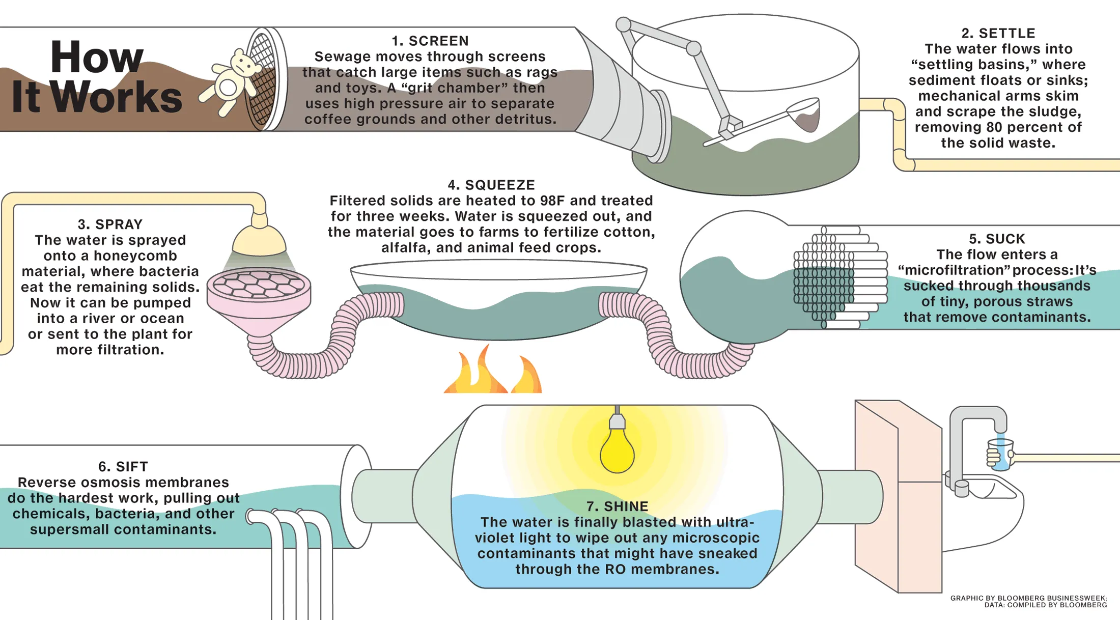 几十年来,污水一直被处理并用于灌溉农作物、公园和高尔夫球场,但使其适合人类消费需要使用更严格的过滤技术,采用聚合物膜。膜的厚度不超过人类的头发,既精致又耐用。使用小于百万分之一毫米的孔径,它们能够消灭微观污染物。