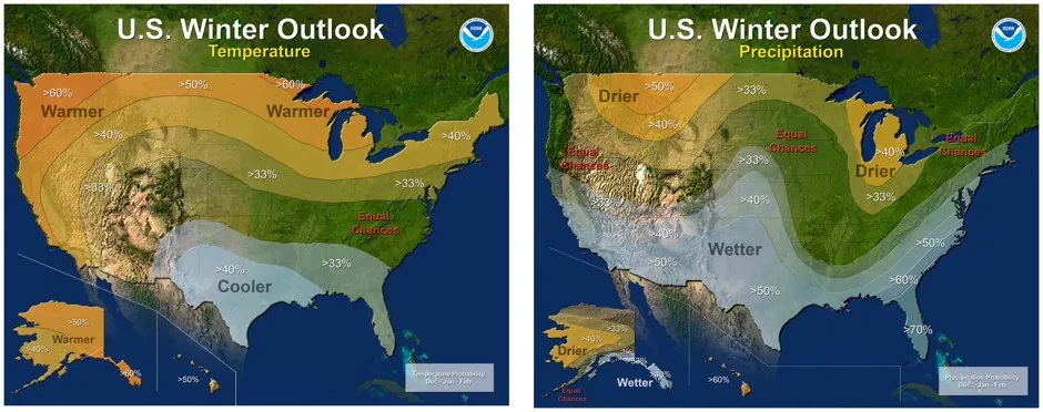 2015年10月美国的三个月温度和降水预测。美国国家海洋和大气管理局通过美联社这个冬天,科学家们认为我们将迎来自1998年以来最强的厄尔尼诺——或 可能是有记录以来最强。你可能在加利福尼亚的背景下听说过它,那里州南部在强厄尔尼诺年份通常会出现大量降雨。(几乎没有办法解决全州的干旱。)美国中西部和东北部的冬天可能会比其他情况下温和。