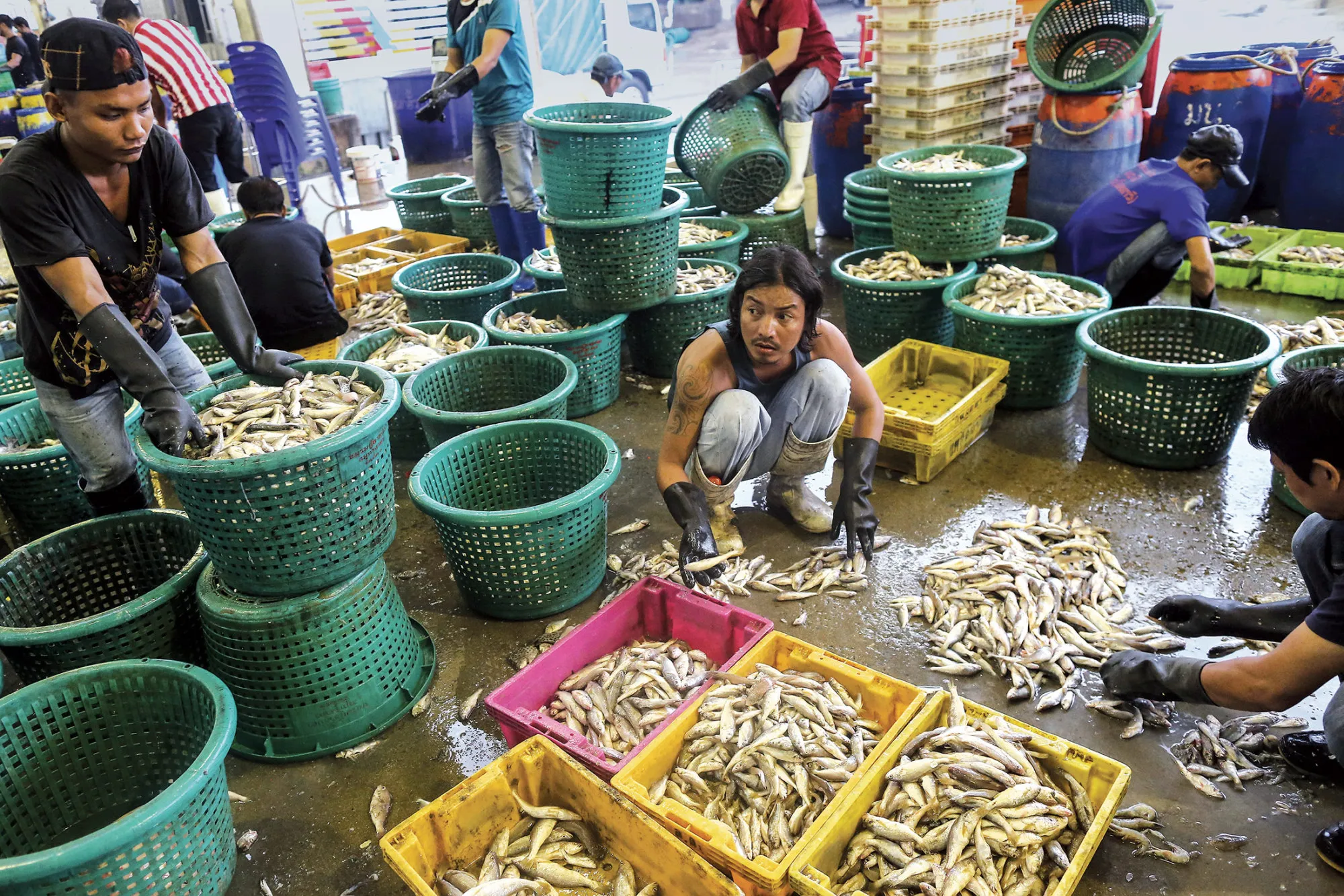 最近在马哈柴的Talay Thai批发海鲜市场,捕获的鱼按大小进行分类。