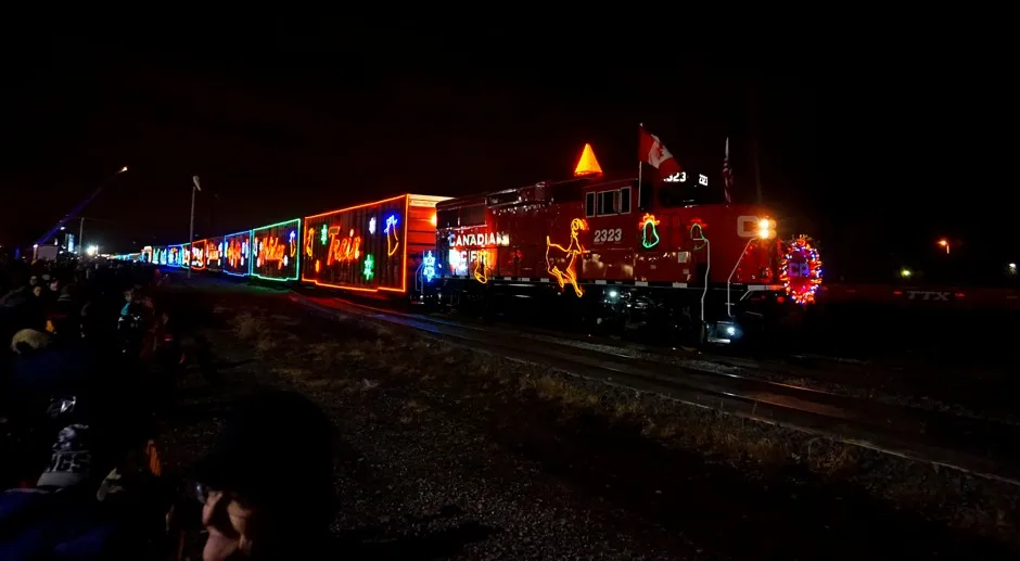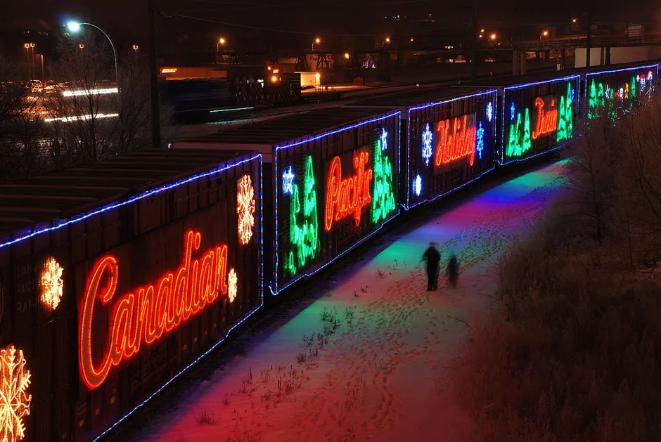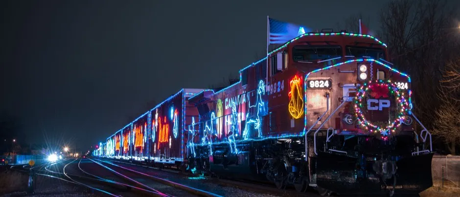 就像圣诞老人的雪橇一样,无法确切知道假日火车何时会经过你的城镇。不过,它在行驶时会一直亮灯,所以如果你在加拿大边境的一个冰冻小镇的火车轨道附近站着,最终一定能捕捉到几秒钟的节日欢乐!