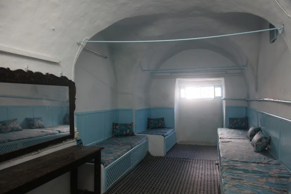 在更衣室里,两位女性闭着眼睛,头上裹着毛巾。墙壁和穹顶天花板漆成白色。木拖鞋安放在蓝绿色的瓷砖壁龛中。当地人知道这个浴室仅限女性;男性绝不会想要进入。