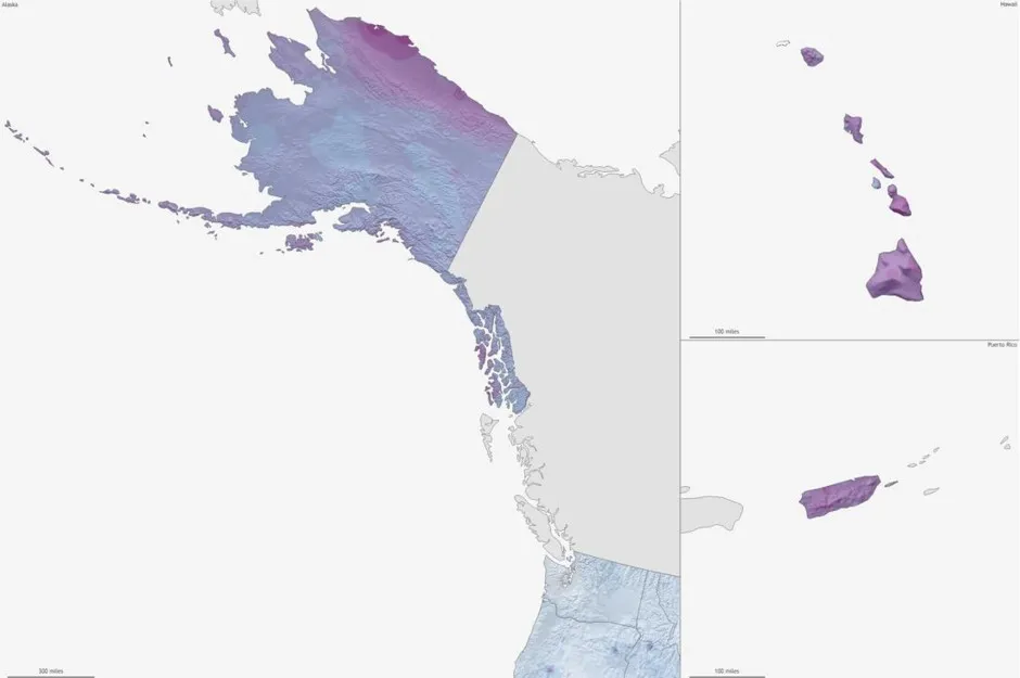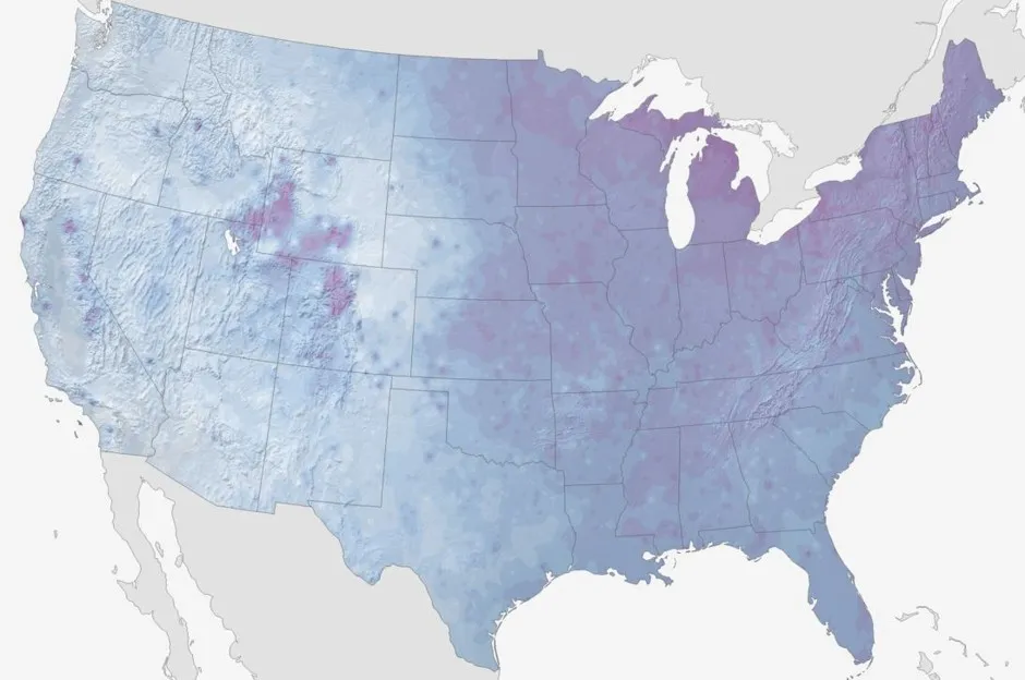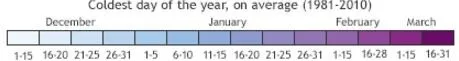 答案在于 这些国家海洋和大气管理局的地图,显示了美国50个州和波多黎各一年中最冷日子的平均日期,从白色(12月初)到浅蓝色(1月中旬)再到茄子色(3月下旬)。这是关键: