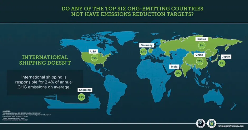 巴黎条约的最新草案文本中没有包含“航运”或“航空”这两个词。国际民航组织表示,明年在其大会上,该组织将决定一个 全球市场基础措施 来减少碳排放。(与此同时,航空公司已经自行采取行动;在2009年,国际航空运输协会行业组织 承诺 每年提高燃油效率1.5%,直到2020年,当时排放将达到峰值,并在2050年前将2005年的排放量减半。)国际海事组织已为2025年建造的船舶设定了一个 能源效率要求,但没有设定总体的 碳排放目标。