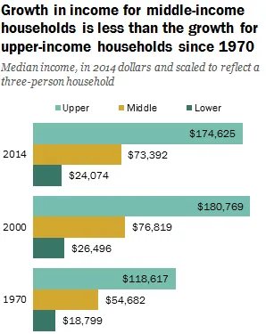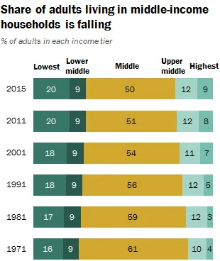 在2015年,中等收入的美国人(年收入在42,000美元到126,000美元之间的三口之家成年人)约占美国人口的一半,自1971年以来稳步下降至61%。在绝对数字上,这一中等收入群体现在约有1.2亿人,几乎与其他经济层次的美国人总数(1.21亿)相同。