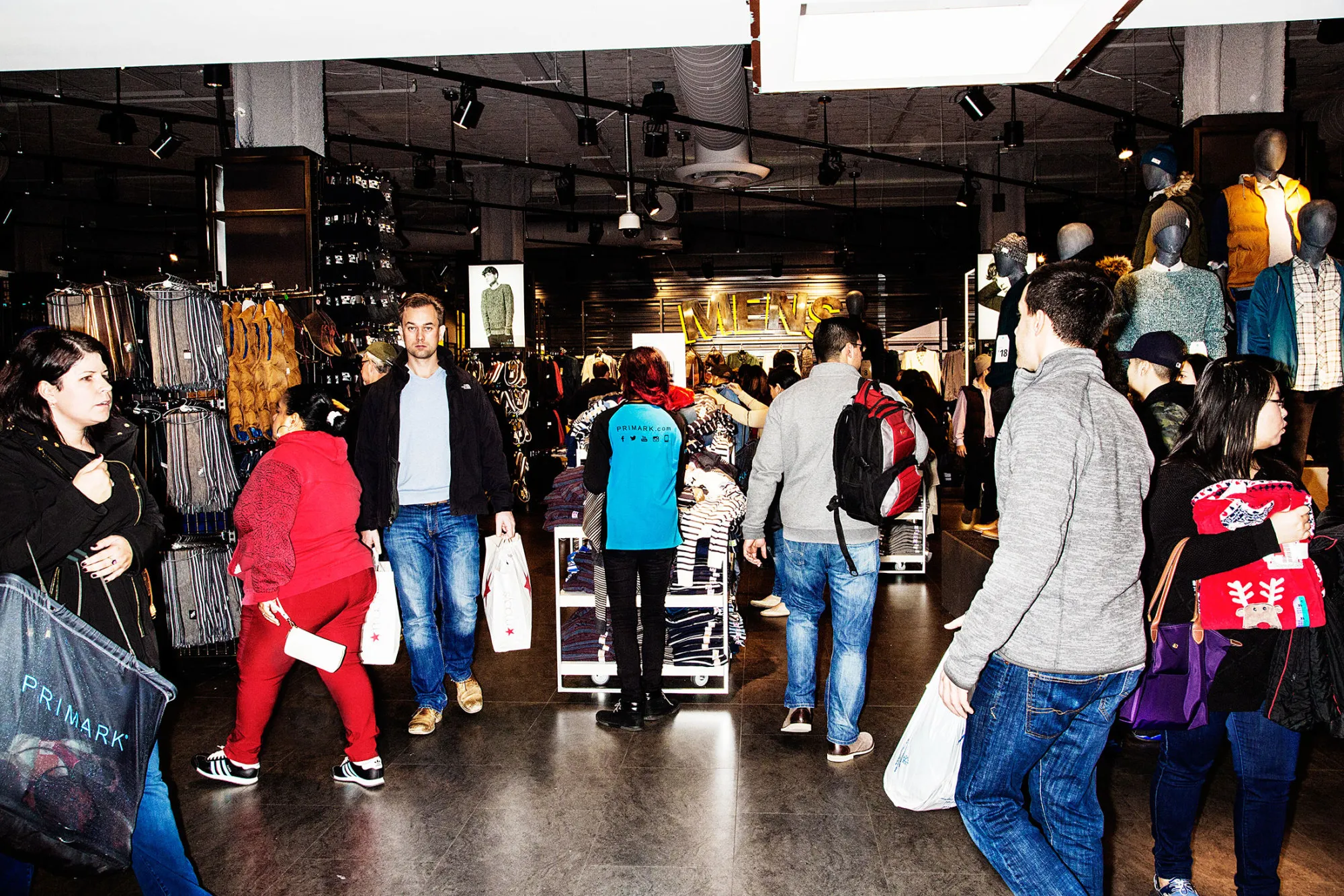 波士顿周六下午,Primark男装区的顾客。摄影师:艾米·隆巴德为《彭博商业周刊》拍摄在这方面,Primark并不总是成功。根据你的观点,这可能是你想要度过周六下午的第一或最后一个地方。在高峰时段,顾客们争抢试衣间。衬衫在地板上被揉成一团,让人想起世界上最大的青少年卧室。牛仔裤从货架上掉落。一切开始感觉有点,嗯,廉价。
