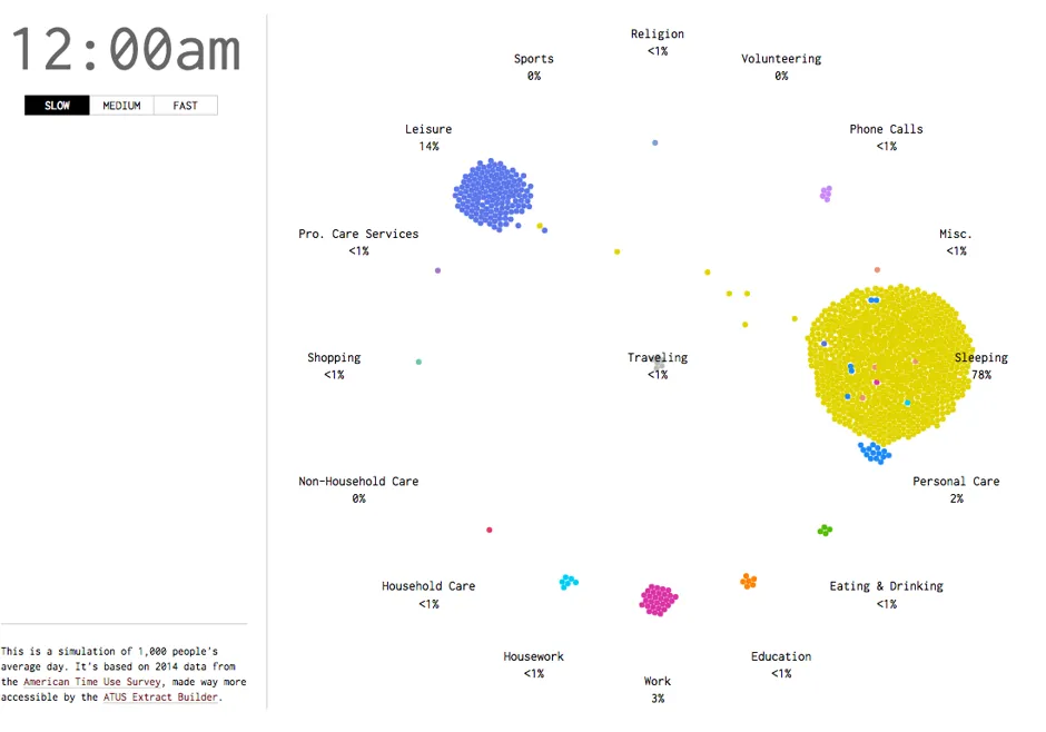 流动数据 统计学家 Nathan Lau 一直在忙于研究人们每天如何花费时间。他已经在 两个 不同的 可视化中展示了2014年美国时间使用调查的数据。现在,Lau 发布了 另一个,完美捕捉了我们日常生活中的混乱与宁静时刻。