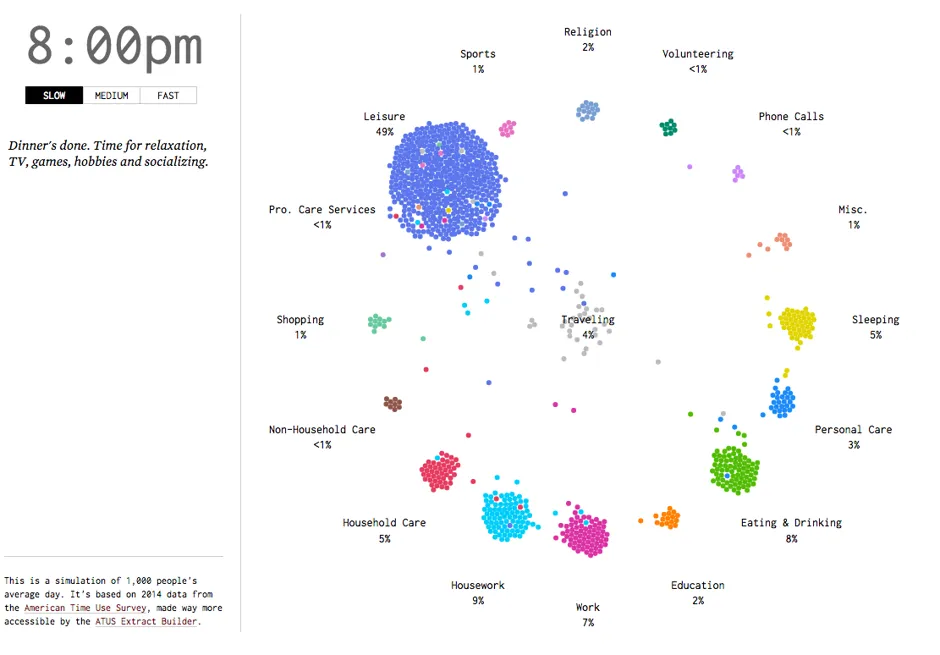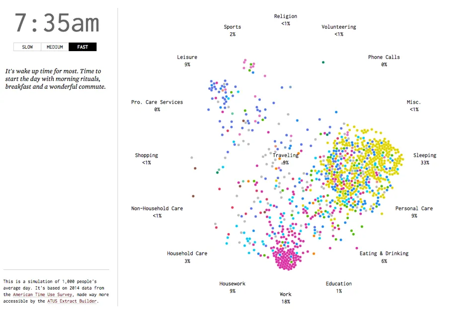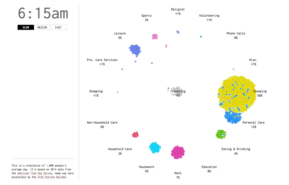 流动数据 统计学家 Nathan Lau 一直在忙于研究人们每天如何花费时间。他已经在 两个 不同的 可视化中展示了2014年美国时间使用调查的数据。现在,Lau 发布了 另一个,完美捕捉了我们日常生活中的混乱与宁静时刻。