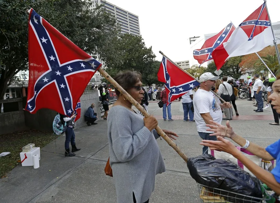 阿琳·巴纳姆,来自俄克拉荷马州,代表“南方退伍军人生命重要”,在2015年12月10日星期四于新奥尔良市政厅前举着一面南方联盟旗帜。美联社照片/杰拉尔德·赫伯特新奥尔良市议会在星期四投票决定拆除四座自19世纪末以来矗立在城市中的南方联盟叛乱纪念碑。这些雕像包括一座纪念南方军将领罗伯特·E·李的雕像,另一座是纪念南方总统杰斐逊·戴维斯的,另一座是献给南方将领P.G.T.博雷戈德的雕像,他设计了南方联盟战旗,这面旗帜最终在一些城市面临退休,经过多年与常识背道而驰。