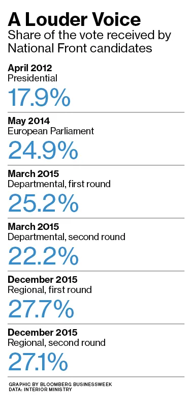 摄影师:克里斯托夫·莫兰/彭博社国民阵线在12月13日的选举中未能控制任何法国地区,但即使在失败中,这个反移民政党在未来几年可能对经济政策产生超出预期的影响。主流政党对国民阵线获得680万票感到震惊——超过了2012年创下的640万票的记录——并呼吁采取紧急行动以克服导致公众不满的经济困境。“没有缓解或胜利主义的空间,”社会党总理曼努埃尔·瓦尔斯在投票当晚的电视讲话中说道。政府必须“更迅速地行动,以取得更多成果,”他说。“这是我们的最后机会,”中右翼共和党人泽维尔·贝特朗说,他获得了社会党的跨党支持,在法国北部击败了国民阵线领导人玛丽娜·勒庞。