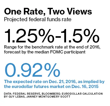 这个范围显著高于市场的预期。Janney Montgomery Scott的首席固定收益策略师Guy LeBas表示,市场预计一年后联邦基金利率将略低于1%。他基于在高度活跃的欧元美元市场中的交易进行计算,交易者利用该市场对美国利率进行押注。(联邦基金利率是大型银行之间进行隔夜贷款时相互收取的费用;提高这一利率会影响其他多种利率。)