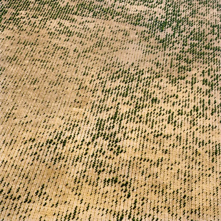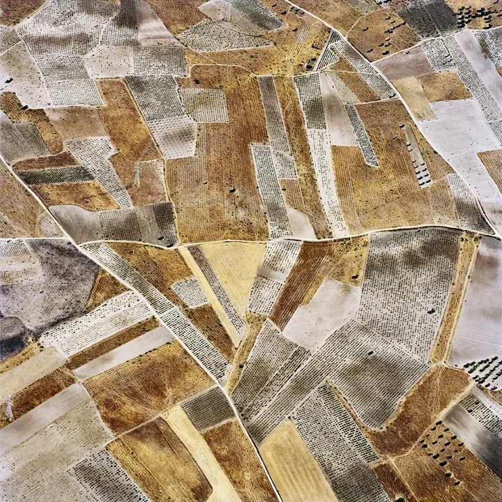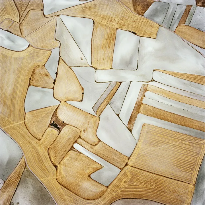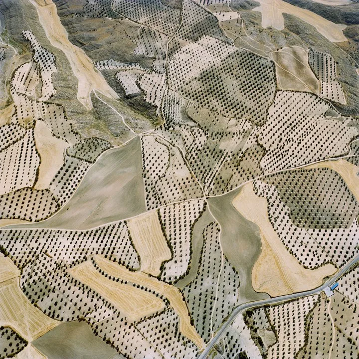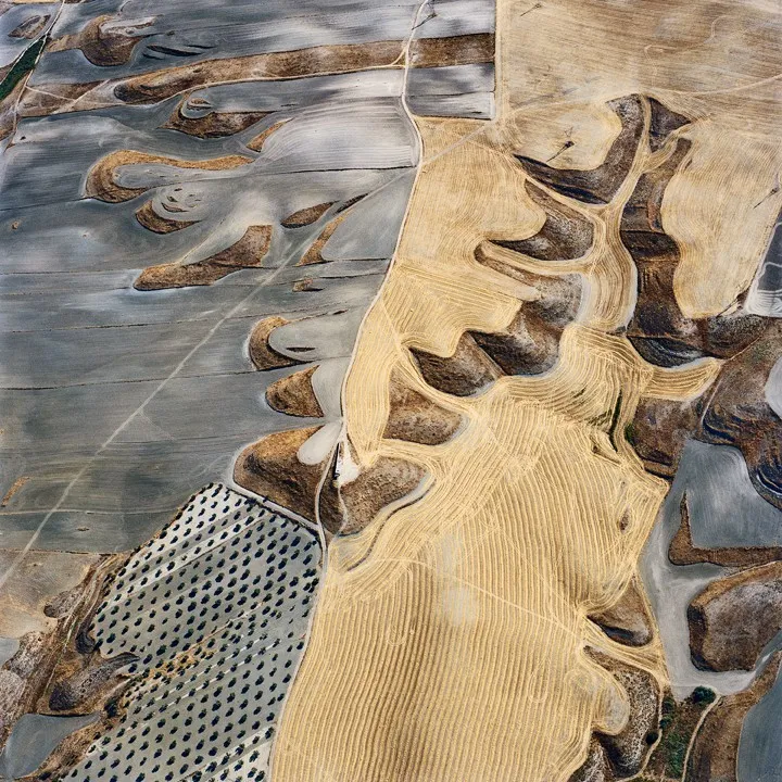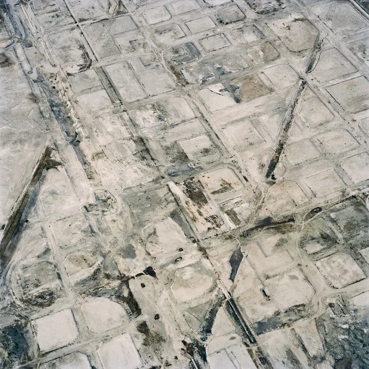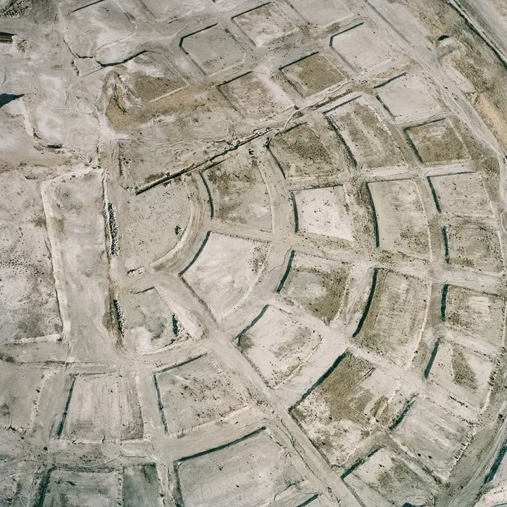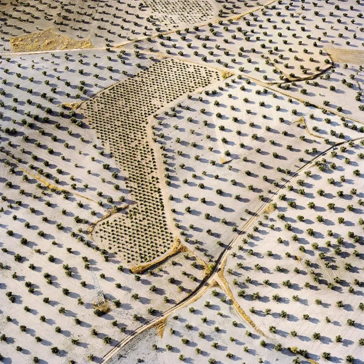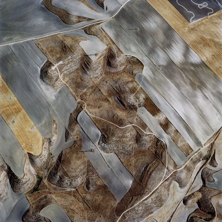 梅塞尔于2013年来到西班牙,在马德里和托莱多拍摄,他对那些同样奇怪、美丽和悲伤的人类影响的风景并不失望。系在直升机的安全带上——用着与1960年代宇航员在月球上使用的相同格式的相机——他记录了大片灰烬般的、反光的 硼砂、整齐排列的橄榄树种植园,以及位于马德里边缘的一个废弃开发项目,看起来像是火星前进基地的幽灵遗迹。