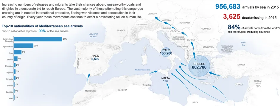 联合国难民事务高级专员仅在今年,920,000名难民和移民通过海路抵达欧洲,如下图所示,联合国难民事务高级专员。而这些只是成功抵达的人:一张在土耳其海岸溺亡的叙利亚幼童的照片“为海上的悲剧赋予了不可磨灭的人性面孔”,正如L.A. Times所写。 日益严重的危机让欧洲领导人感到 绝望,虽然一些国家已 设定了慷慨的配额来接纳寻求庇护者,但大多数国家并没有。对恐怖分子可能利用这一危机作为掩护以不被发现的担忧,使得许多欧盟领导人未能对可能是自第二次世界大战以来最严重的 人道主义危机 做出适当回应。