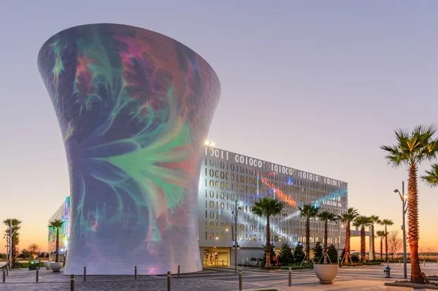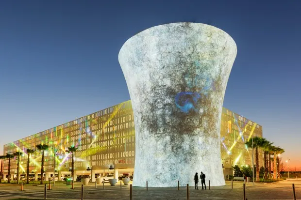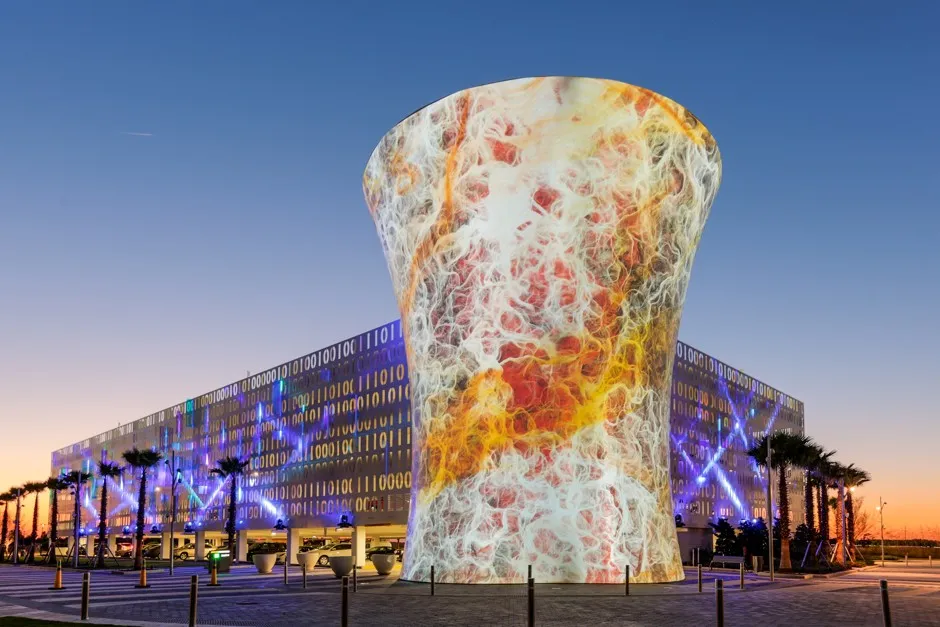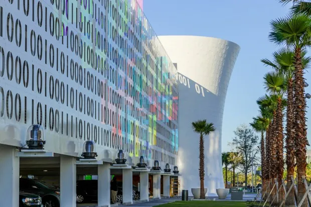 “我设想的不仅是 代码墙,还有 灯塔,成为数字艺术家的博物馆,”Jefre说。他没有在装置本身上涂抹颜色,而是让自然的光影将车库变成一幅活生生的壁画。Jefre寻求了著名的戏剧设计师 Michael Counts 和 3-Legged Dog 制作公司来策划和创作每晚投影到 灯塔 上的特定表演。这个想法是利用塔楼展示来自全国各地的各种数字艺术家的艺术作品。