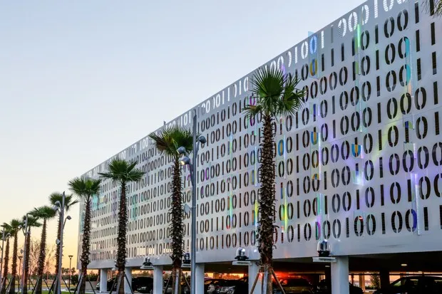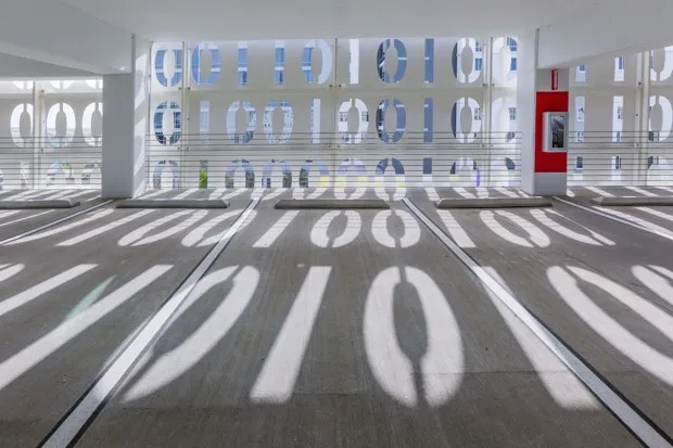 随着太阳在白天的移动,嵌入其中的二向色玻璃面板——在阳光照射下反射出不同的颜色——在墙上投射出红色、蓝色、绿色和黄色的“万花筒”。在夜晚,精心编排的LED灯光让车库焕发生机。