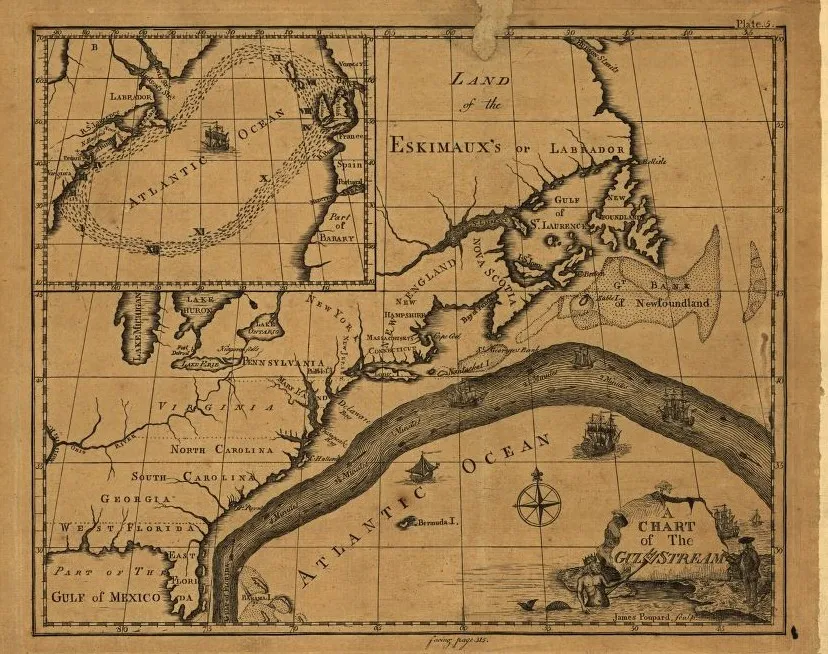本杰明·富兰克林和他的表弟蒂莫西·福尔杰被认为是首次命名和绘制墨西哥湾流的——这股温暖而强劲的洋流从墨西哥湾向东北方向推送,沿着大西洋海岸,朝向欧洲。尽管有许多版本,上面所示的地图是由美国哲学学会于1786年印刷的,现在属于国会图书馆。