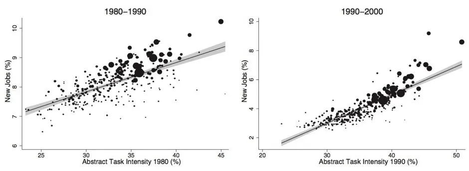 在1970年至1980年间,随着城市抽象工人比例的增加,工作创造(以十年初不存在的工作为衡量标准)略有下降。圆圈的大小代表人口,95%的置信区间以灰色显示。贝尔杰 & 弗雷 / 区域科学与城市经济学,2015这一趋势随着计算机革命而改变。从1980年起,充满抽象技能居民的城市能够应对与计算机相关的任务,经历了急剧的就业增长。简单来说,伯杰表示,分析发现“在拥有大量抽象技能工人的城市中,计算机的采用率要高得多,而在这些城市中,计算机的更广泛采用又促进了新工作的创造。”