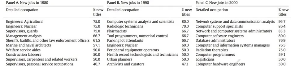 上面的三个面板显示了过去十年中新相关工作的最高比例的10个职业。因此,在面板A中,例如,1980年75%的农业工程职位在1970年并不存在。到2000年,面板C中,所有的工作都与计算机相关。伯杰 & 弗雷 / 区域科学与城市经济学,2015研究人员报告称,在此之前,抽象技能与新工作之间“几乎没有关系”,而在1980年后出现了“显著强烈的关系”。上表显示了1970-2000年期间新职位名称比例最高的职业。在计算机普及之前,许多基于“常规”技能的行业进入了名单,包括福利助手和建筑工人。