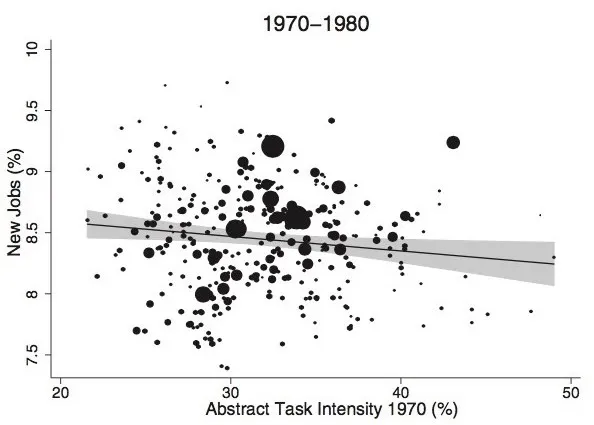 研究的第二个(也是更具新颖性)见解是,这种劳动技能的转变如何改变了美国城市的工作模式。在这里,贝尔杰和弗雷发现,在1980年之前,城市中新工作类型与该城市抽象工人的比例之间没有真正的关系。如果说有什么的话,正如下图所示,从1970年到1980年,这些因素之间存在轻微的负相关——这意味着拥有更多抽象工人的城市在那段时间内工作创造 较慢。