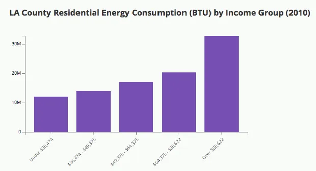 考虑到低收入家庭往往居住在多户建筑中,或许并不奇怪,能源使用最高的家庭也是收入最高的家庭。富裕的海滨马里布居民的人均能源使用量是位于洛杉矶东南部的工人阶级贝尔市居民的10倍以上。