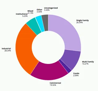 按建筑类型的能源消费。洛杉矶能源地图在2010年,照明、供暖和电气化洛杉矶县建筑消耗了192.47万亿 BTU。(一个BTU是将一磅水加热一度所需的能量;平均美国家庭每年使用 9000万BTU。)住宅占洛杉矶县建筑的大多数,消耗了所有类型中最多的能源:占总建筑能源的39%。其中,单户住宅使用了62%。