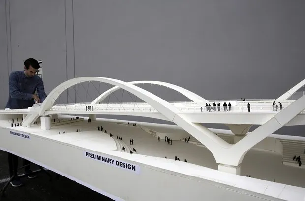 2016年1月27日,洛杉矶展示了新第六街高架桥的初步设计。美联社照片/达米安·多瓦尔根斯最终,桥梁不得不被替换。即使是保护主义者也同意:“我们非常遗憾地承认,1932年的第六街高架桥无法拯救。尽管经过多年的研究和与全球专家的咨询,保护协会和其他人仍无法找到阻止或逆转正在慢慢摧毁桥梁的碱-硅反应的方法,”洛杉矶保护协会在新闻发布中表示。